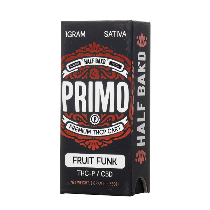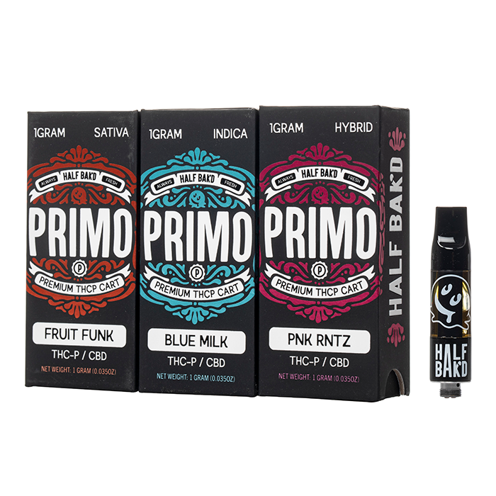 Discover Half Bak'd Primo Cartridge, featuring 1 gram of THC-P balanced with CBD in a postless 510 cartridge to deliver an exceptional blend of cannabinoids.